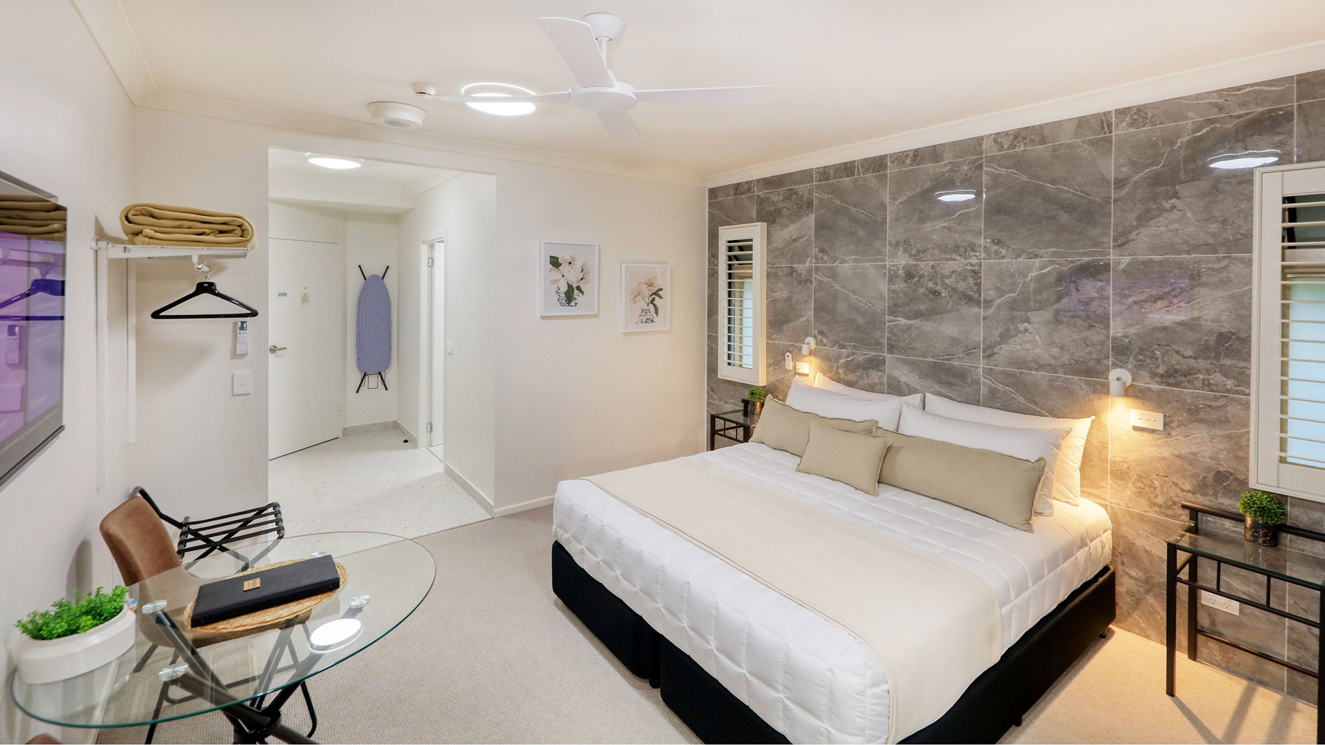 The BEST room in Town!!! Overlooking the pool area, our brand new Deluxe King Rooms offer a full sized king bed and are luxuriously appointed to meet the most discerning of guests. Each room offers air con, tea and coffee making facilities, with kitchen sink, microwave, a wall mounted television,and ironing facilities.