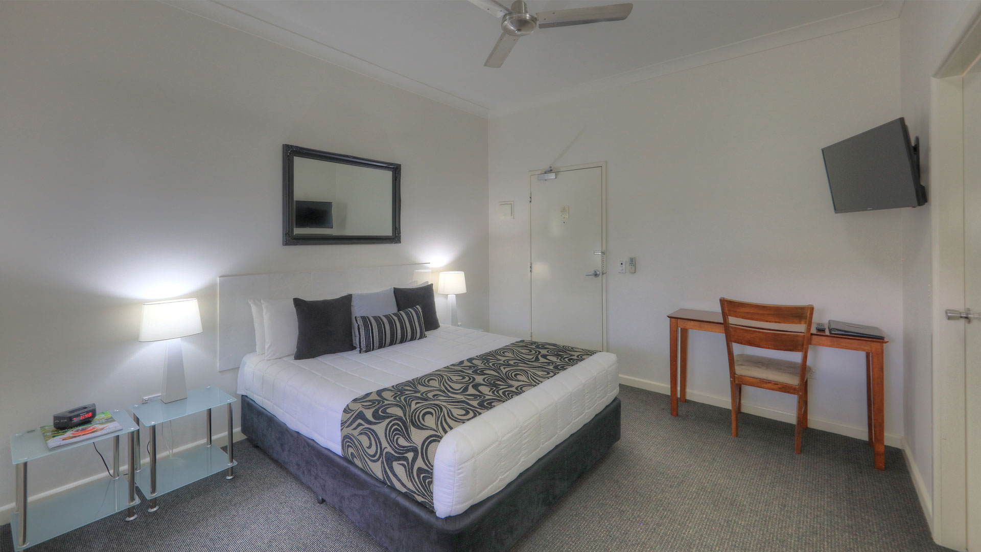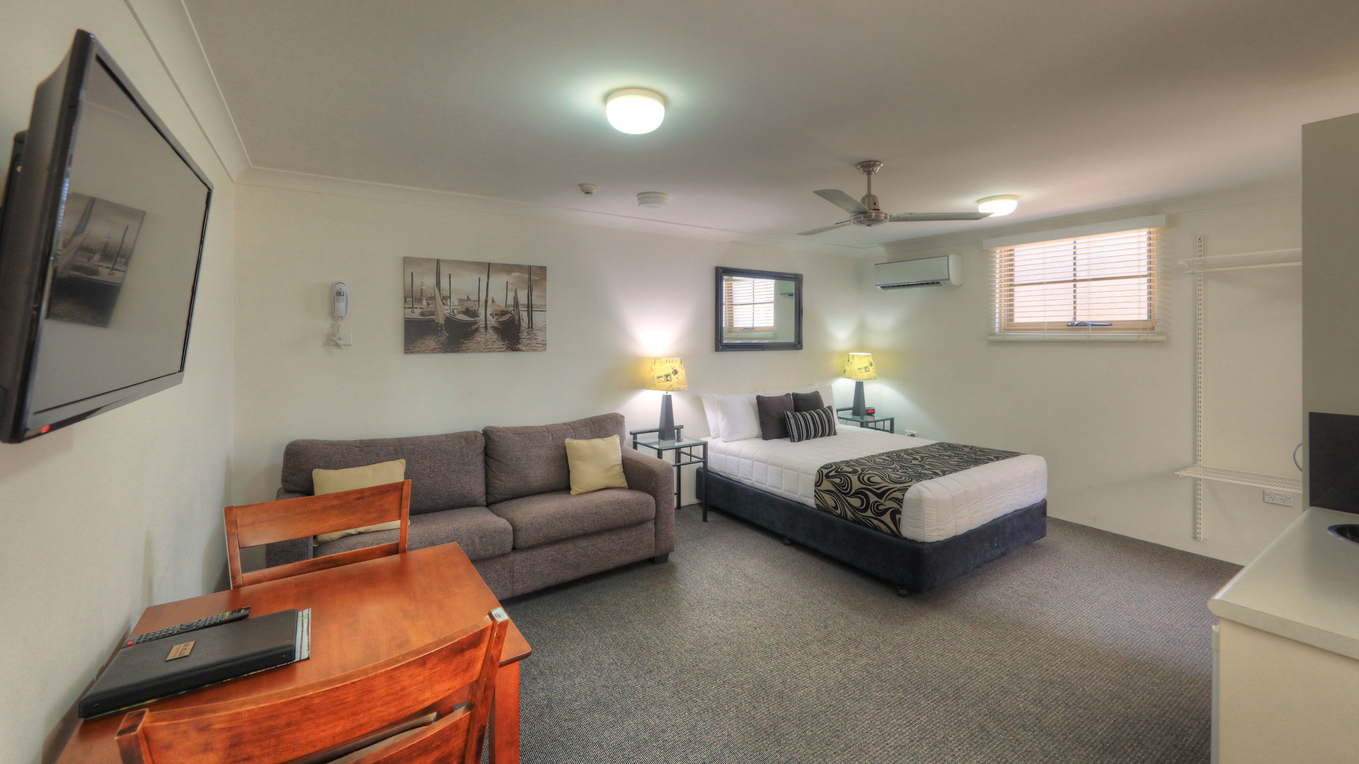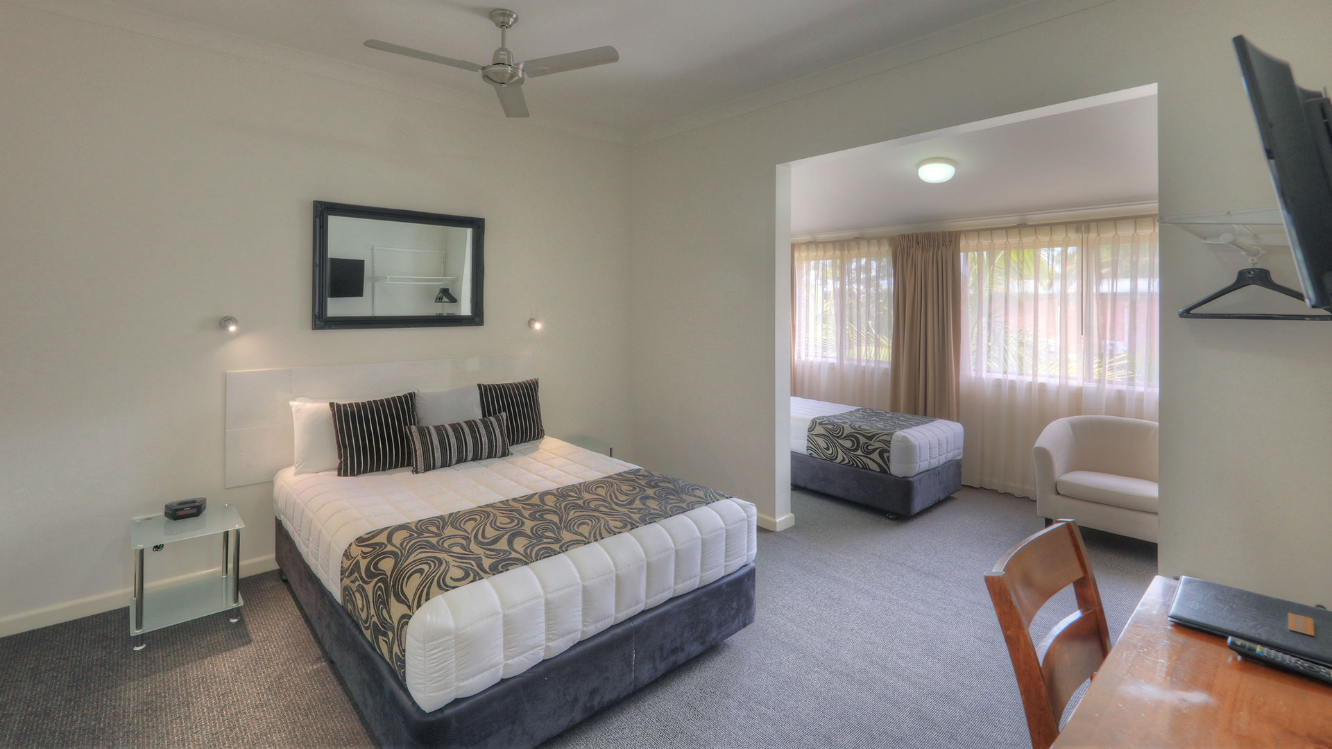 At Heritage River Motor Inn, all our rooms have air con, tea and coffee making facilities, with kitchen sink, microwave, queen and single bed or a queen bed only. Each room has a wall mounted television, and ironing facilities.