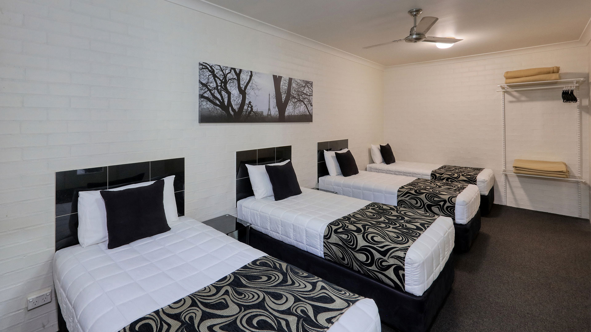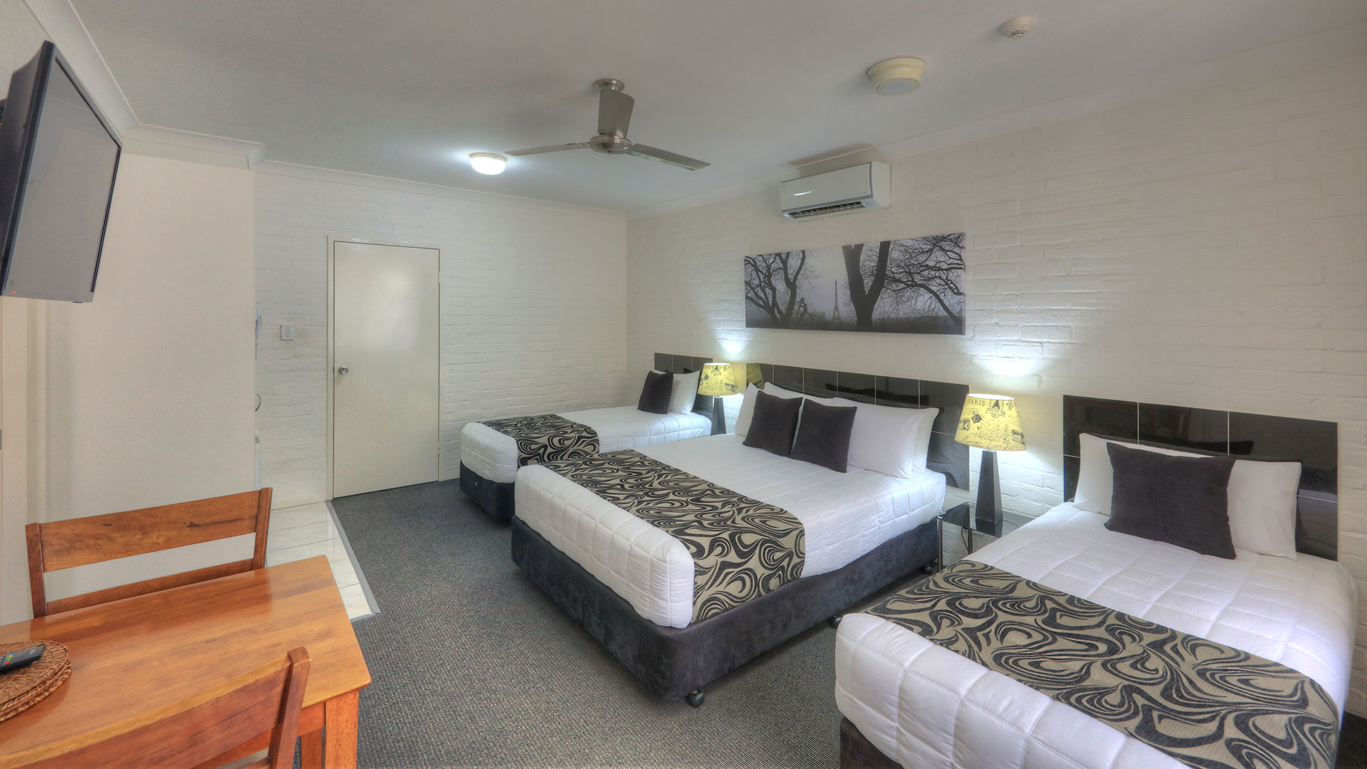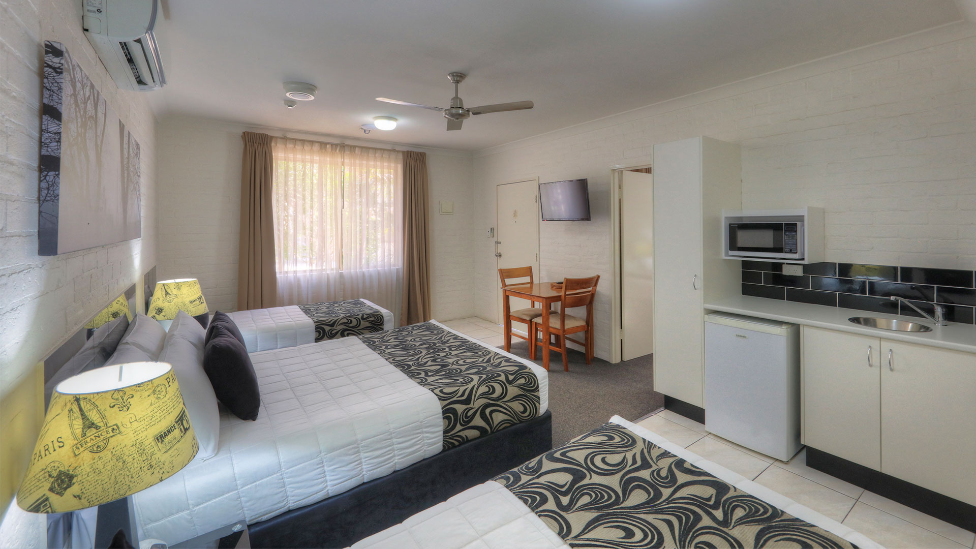 Family Rooms. Spacious and smoke free. Our family rooms are 2 bedrooms, with veranda's, and out door seating, to relax and enjoy the afternoon breeze, or just sit and read a book beside our pool and listen to the birds. Room configurations . 1 queen bed, 4 single beds, sleeps 6 people. This room also has a sofa for watching TV. Our other 2 bedroom family room has 2 queen beds, and 2 single beds sleeping 6 people.