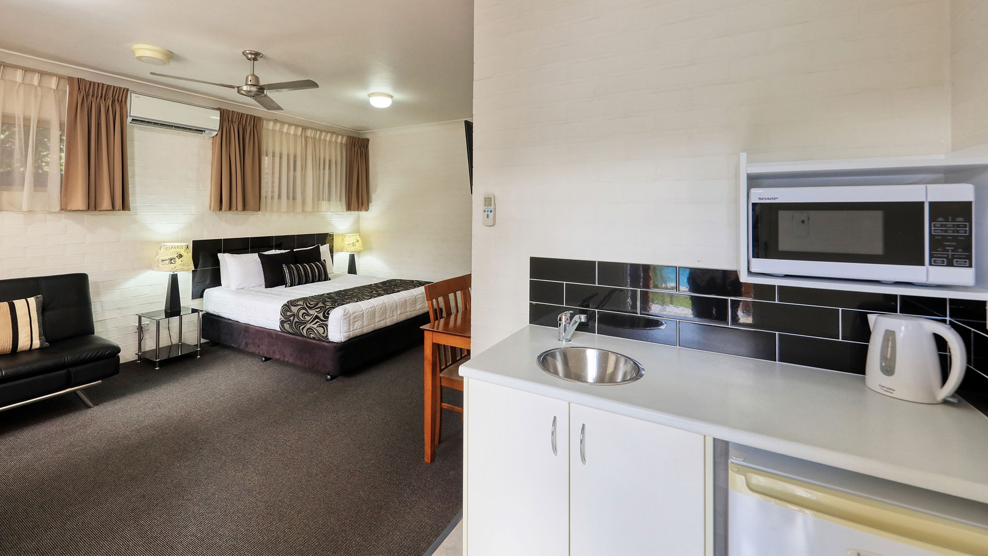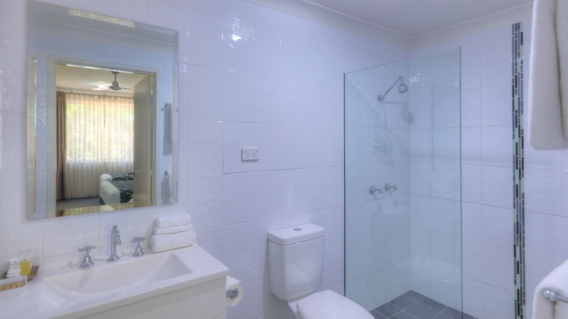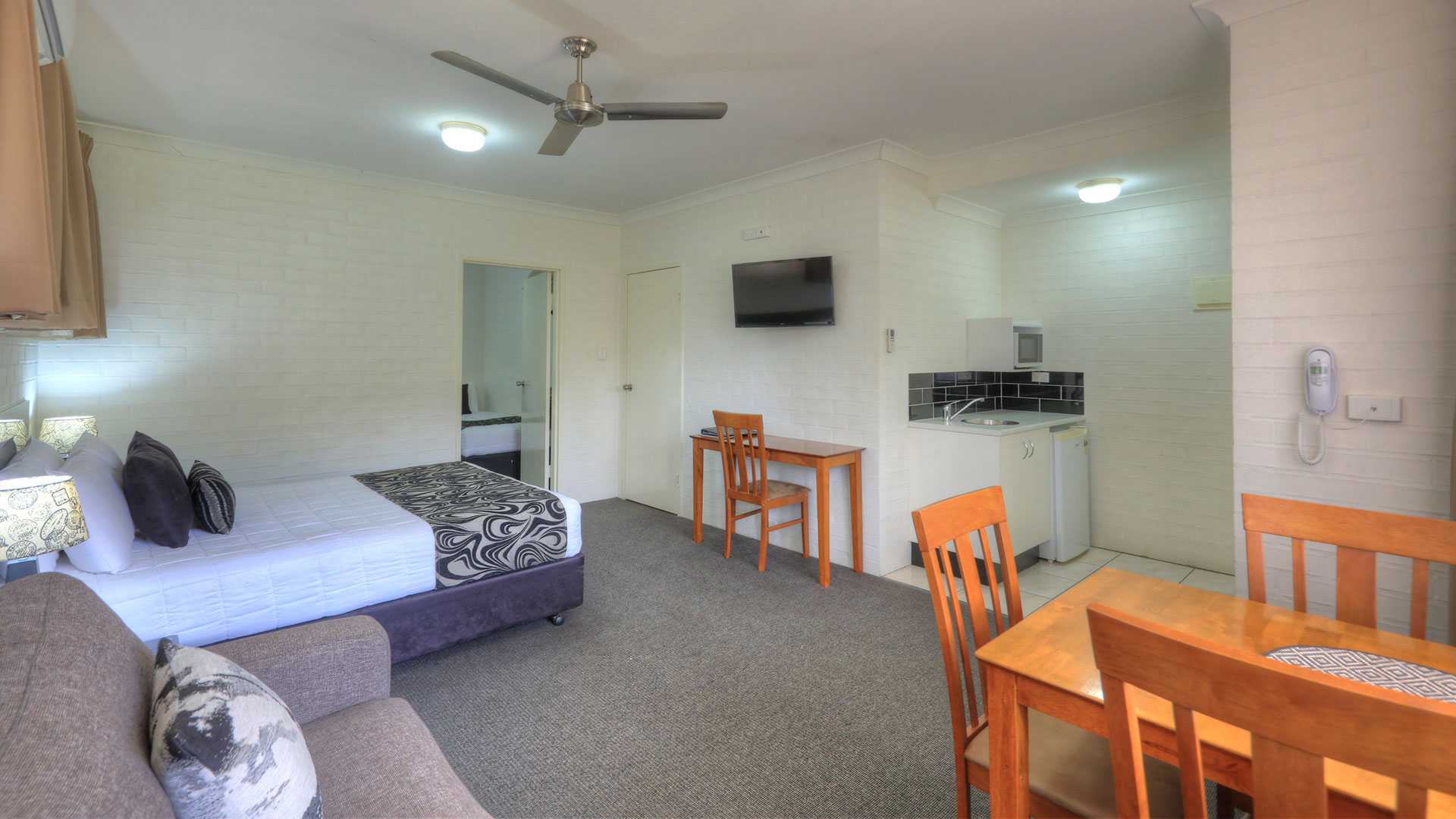 Family Rooms. Spacious and smoke free. Our family rooms are 2 bedrooms, with veranda's, and out door seating, to relax and enjoy the afternoon breeze, or just sit and read a book beside our pool and listen to the birds. Room configurations . 1 queen bed, 4 single beds, sleeps 6 people. This room also has a sofa for watching TV. Our other 2 bedroom family room has 2 queen beds, and 2 single beds sleeping 6 people.