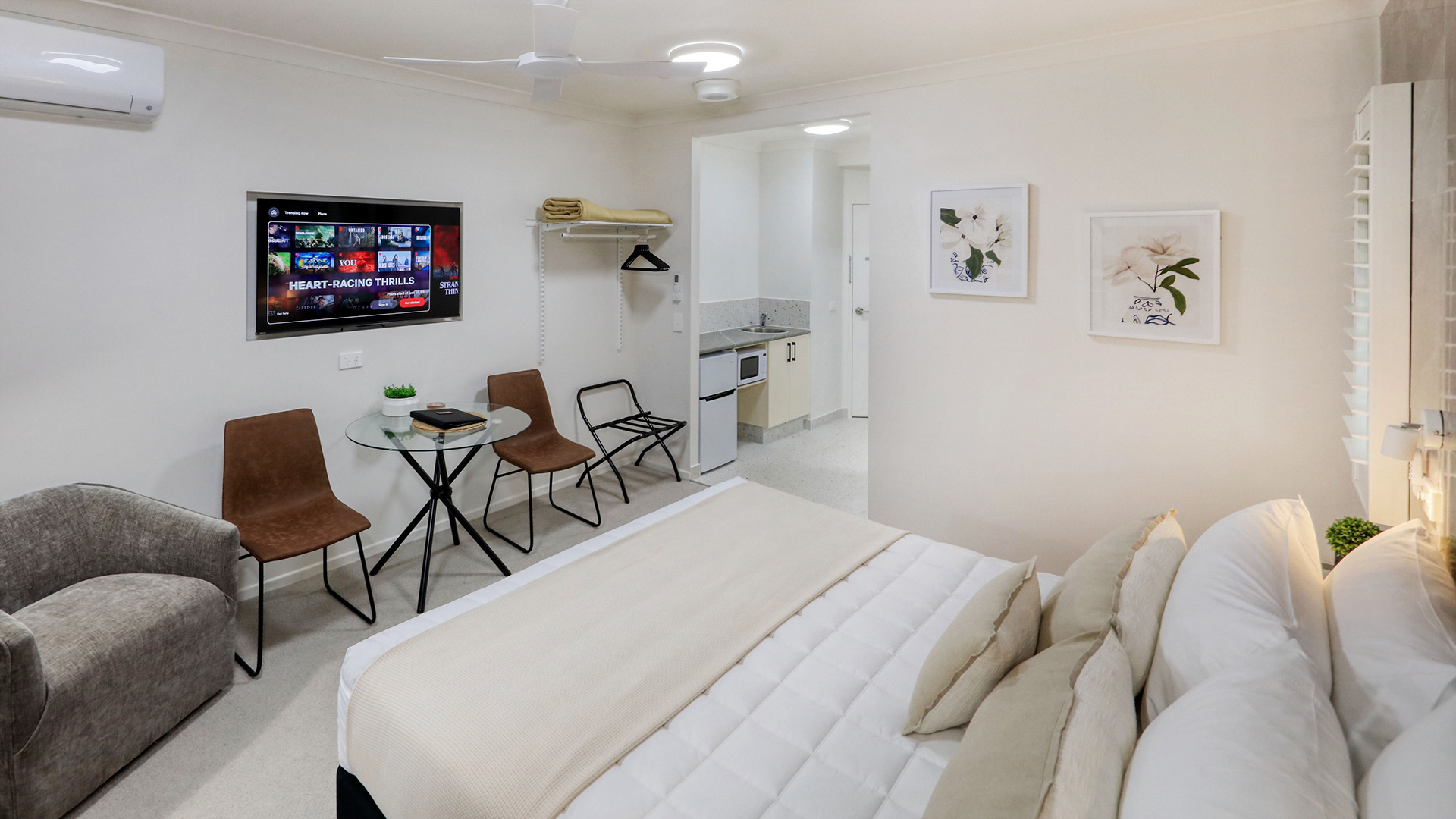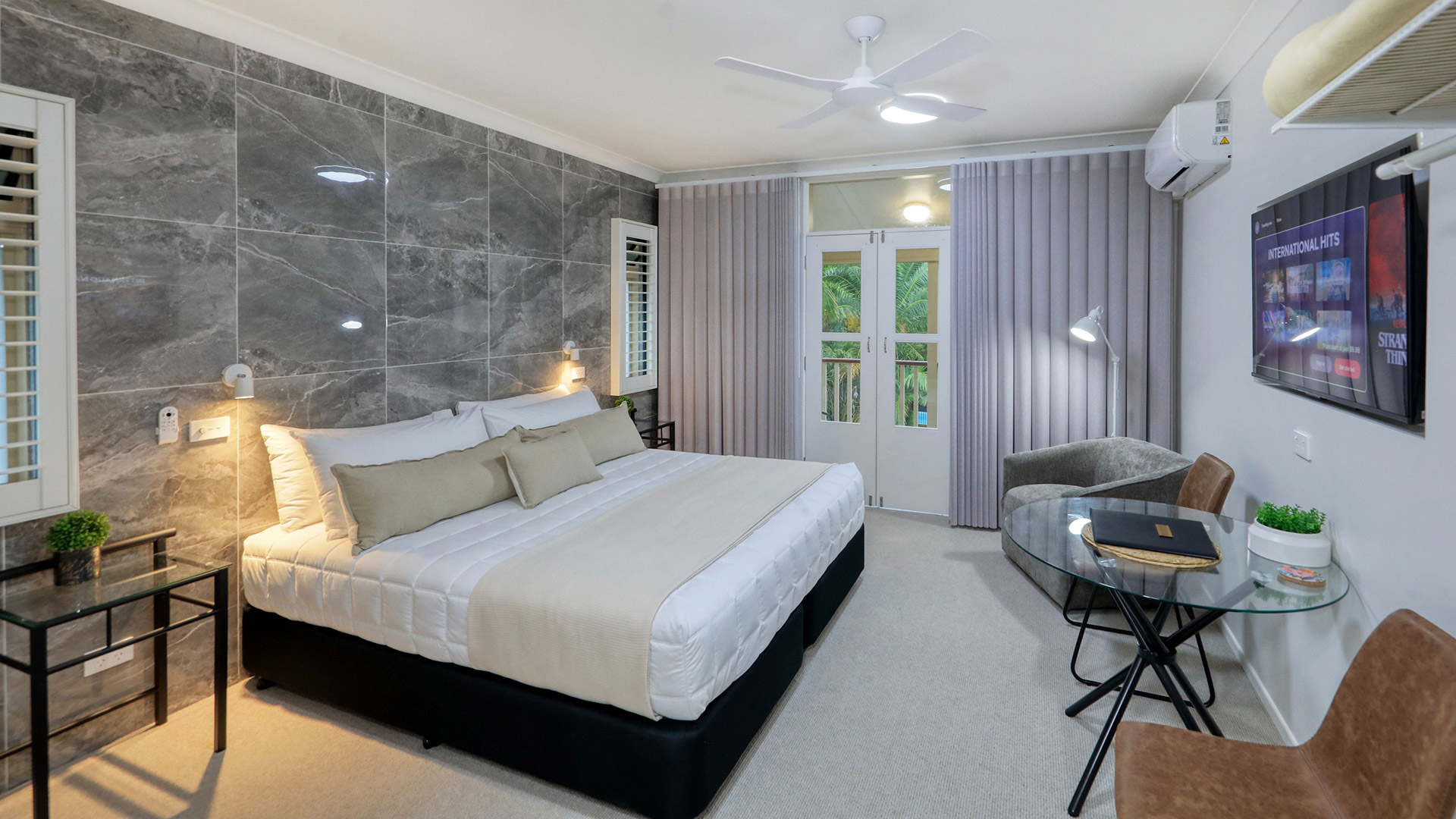 The BEST room in Town!!! Overlooking the pool area, our brand new Deluxe King Rooms offer a full sized king bed and are luxuriously appointed to meet the most discerning of guests. Each room offers air con, tea and coffee making facilities, with kitchen sink, microwave, a wall mounted television,and ironing facilities.