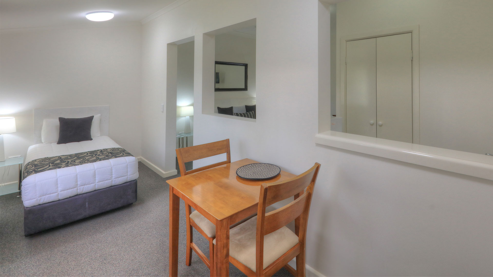 Executive Queen rooms offer a spacious smoke free room with 1 queen and 1 single bed. This room suits the single or twin share travellers. A half wall between the beds offers the ultimate comfort and privacy. Wall mounted TV, air con, tea and coffee making facilities and fresh milk provided .Secure off street parking, very quiet rooms. We also have Executive Queen rooms with a queen bed only, a rollerway single can also be supplied.