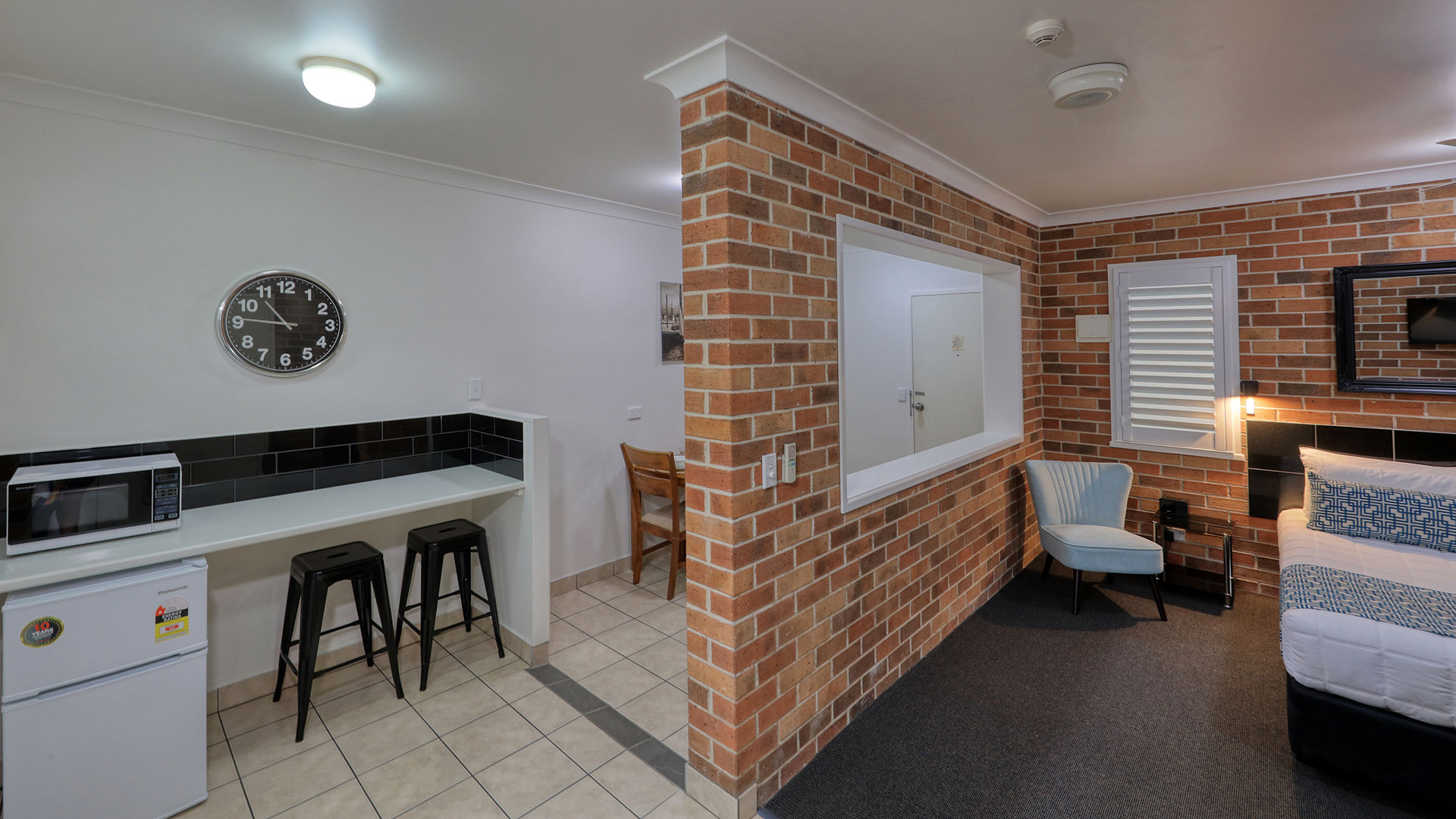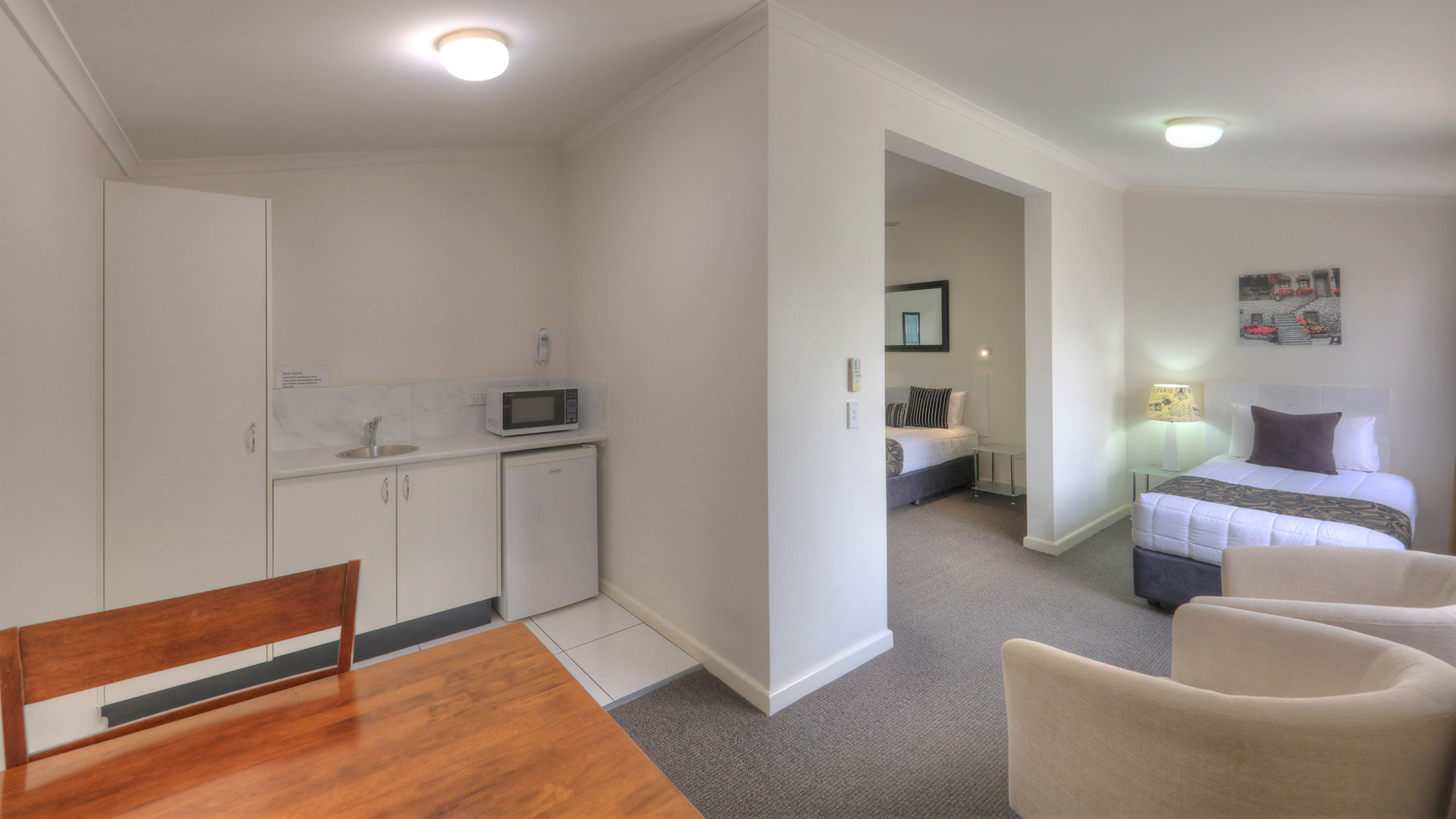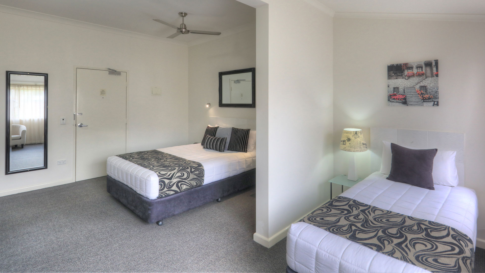 Designed for the comfort of the disabled and carers, our Executive Queen Access rooms offer spacious smoke free rooms with 1 queen and 1 single bed. A half wall between the beds offers the ultimate comfort and privacy. Wall mounted TV, air con, tea and coffee making facilities and fresh milk provided. Secure off street parking, very quiet rooms. We have 2 Access rooms and they both comply with all regulated facilities .