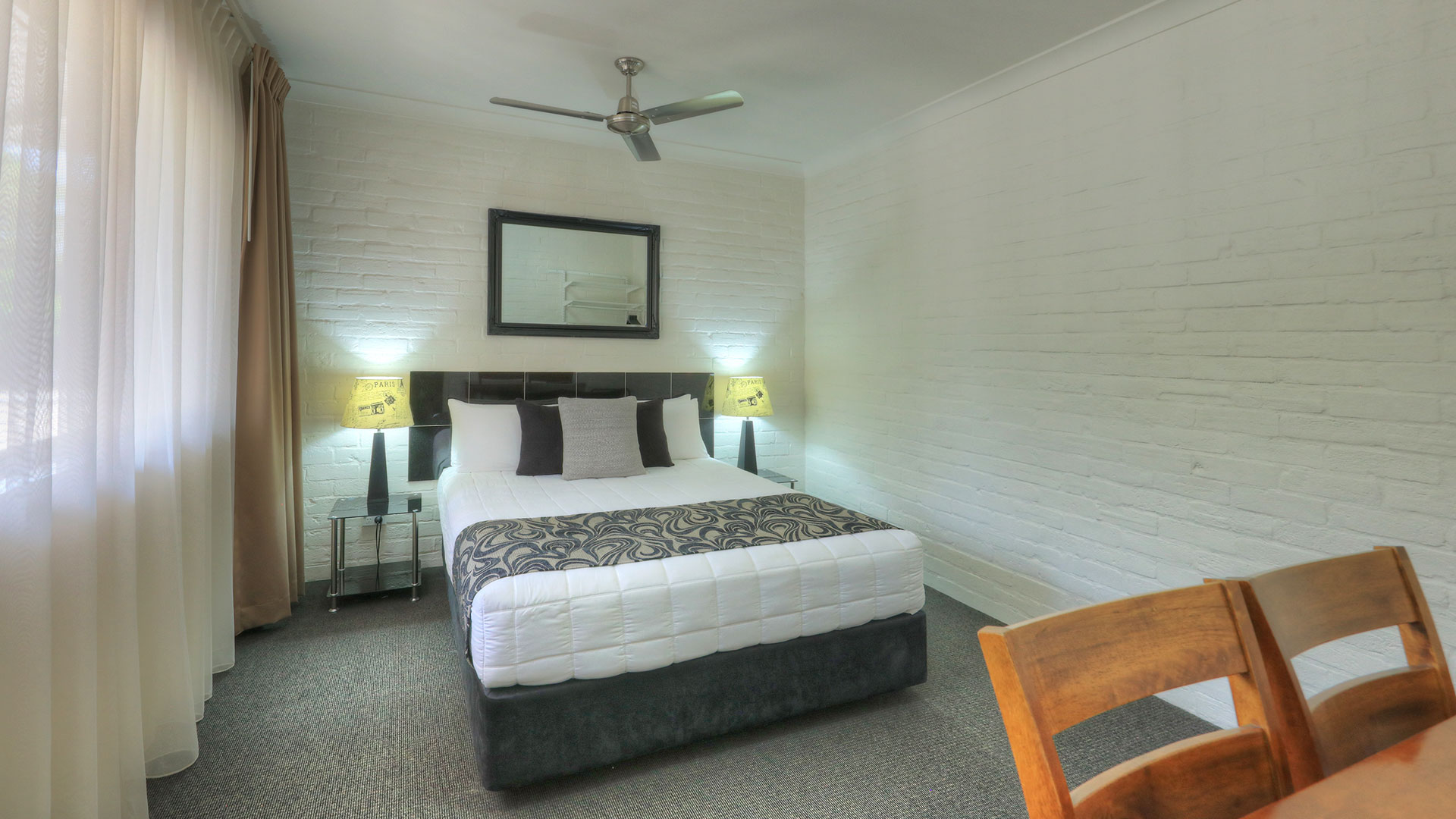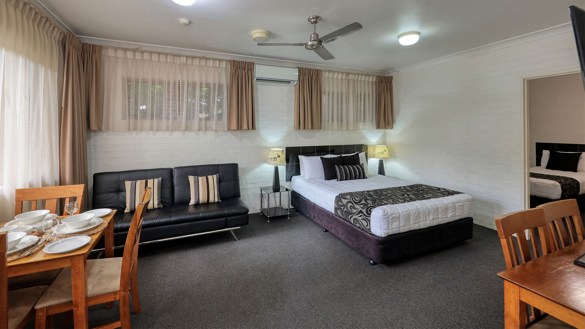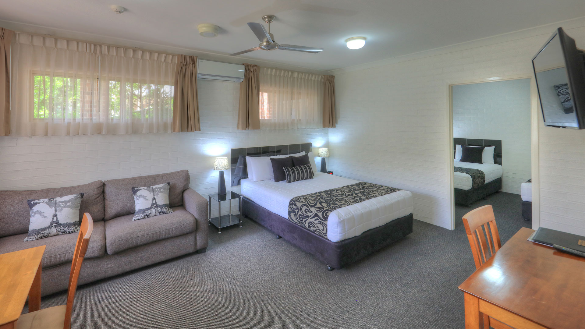 Family Rooms. Spacious and smoke free. Our family rooms are 2 bedrooms, with veranda's, and out door seating, to relax and enjoy the afternoon breeze, or just sit and read a book beside our pool and listen to the birds. Room configurations . 1 queen bed, 4 single beds, sleeps 6 people. This room also has a sofa for watching TV. Our other 2 bedroom family room has 2 queen beds, and 2 single beds sleeping 6 people.